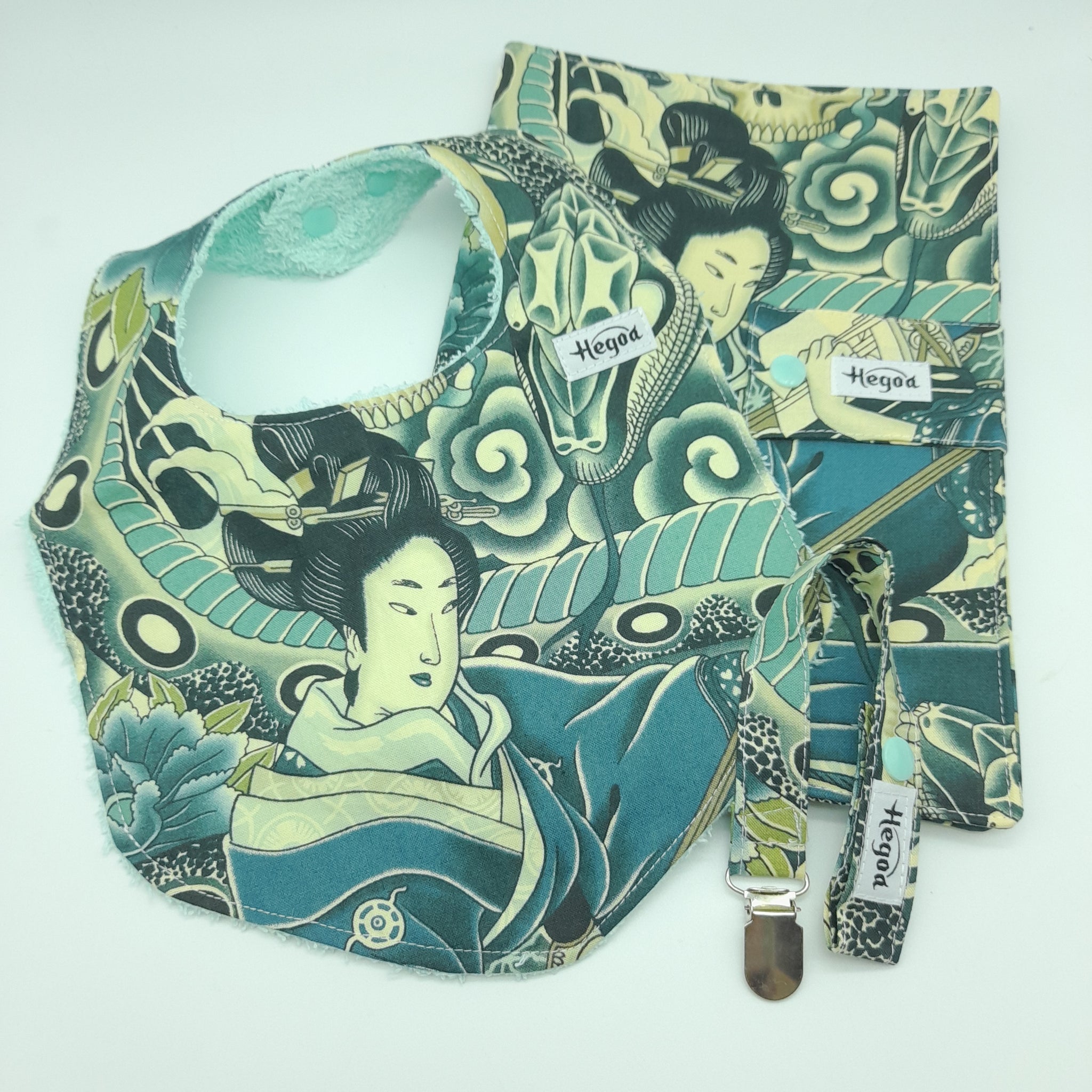 Este pack lo tiene TODO: babero, chupetero y portapañal con dos bolsillos, porque ir preparado es un arte… y aquí te damos el kit básico.