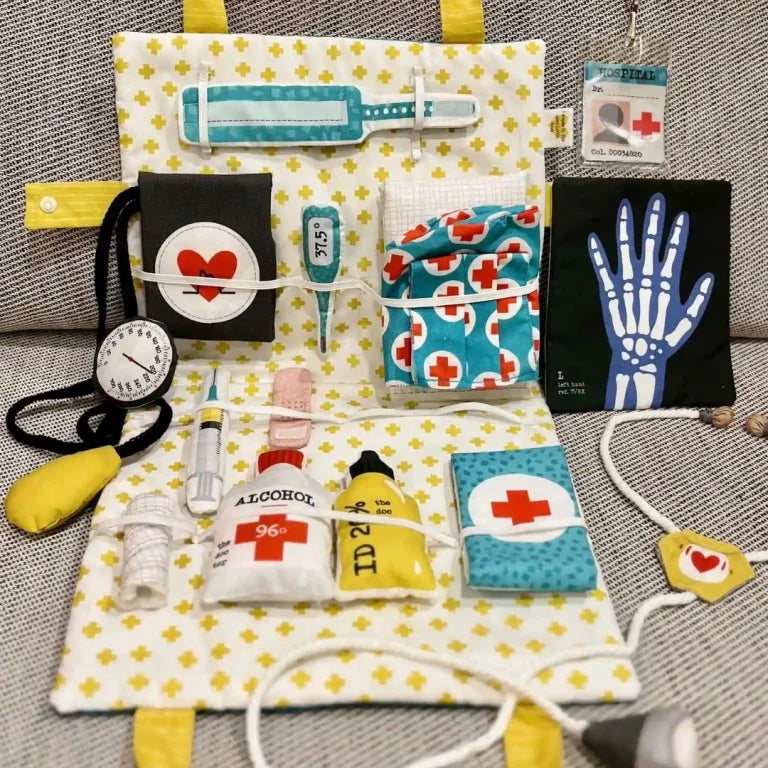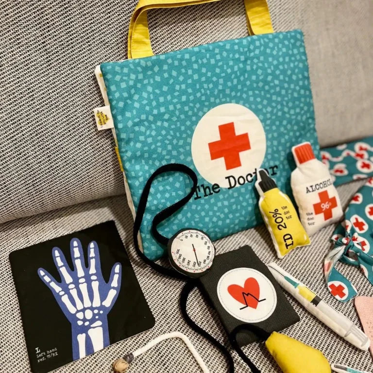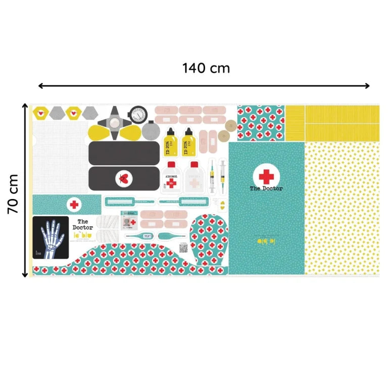 Panel de tela para cortar y coser. El panel The Doctor mide 140 x 70 cm para hacer un maletín de médico o de infermería que contiene todos los utensilios para la cura de pacientes: tomar la presión, obscultar el corazón, curar con alcohol, tiritas, radiografía e ¡incluso tiene una escayola para los brazos rotos!. Es un panel divertido y didáctico que es juego y disfraz a la vez. Cuando se acaba la cura, todos los utensilios se guardan en el maletín para que todo esté en orden y que sea portátil.