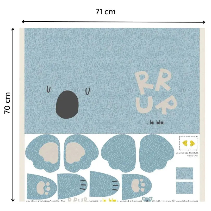 Panel de tela para cortar y coser. El panel mide 70 x 71 cm para coser una mochila infantil en forma de koala. La mochila terminada mide aproximadamente 31 x 36 cm de ancho y largo, respectivamente, sin contar las patas y la cola.