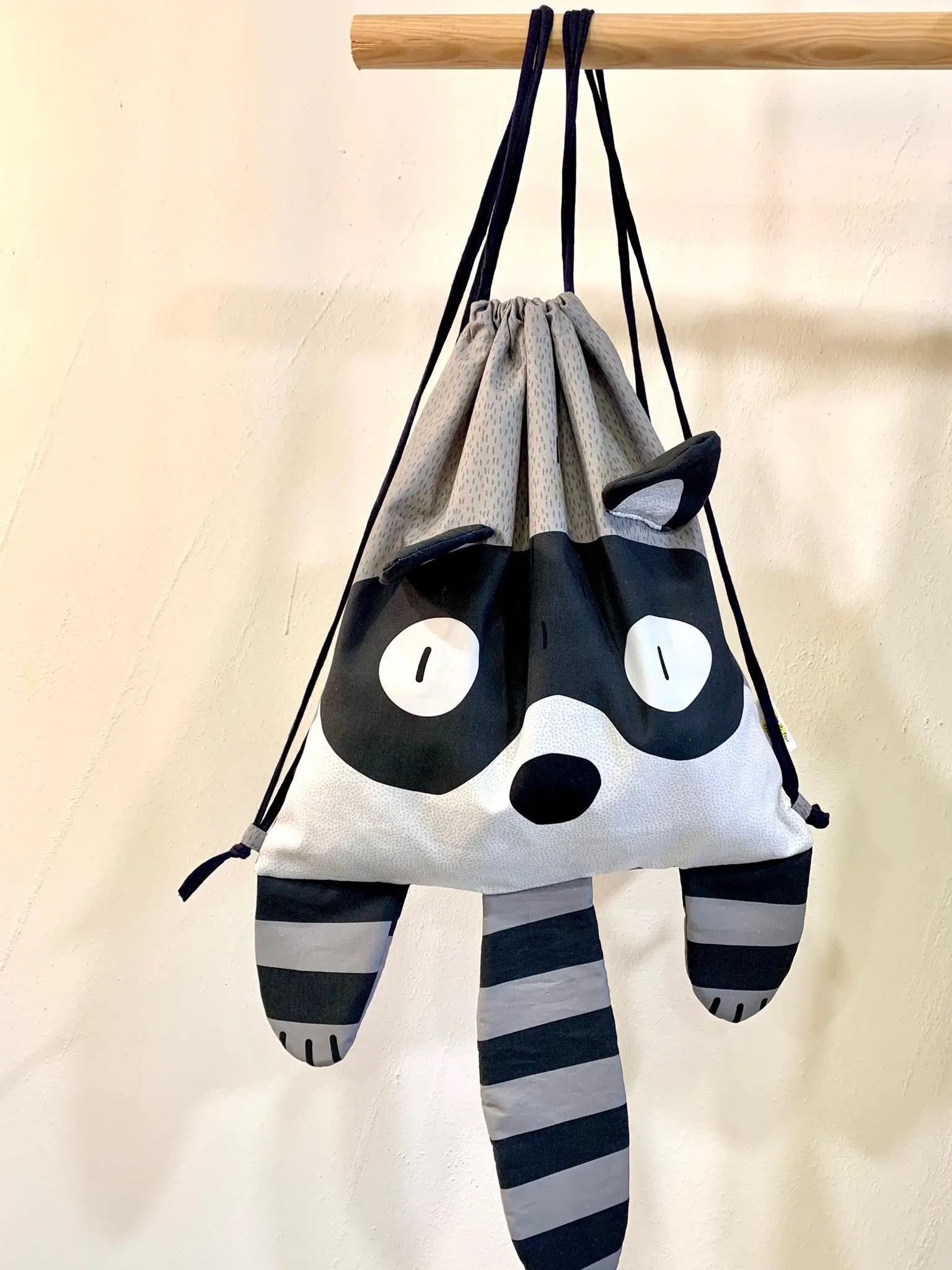Panel de tela para cortar y coser. El panel mide 70 x 71 cm para coser una mochila infantil en forma de mapache. La mochila terminada mide aproximadamente 31 x 36 cm de ancho y largo, respectivamente, sin contar las patas y la cola.